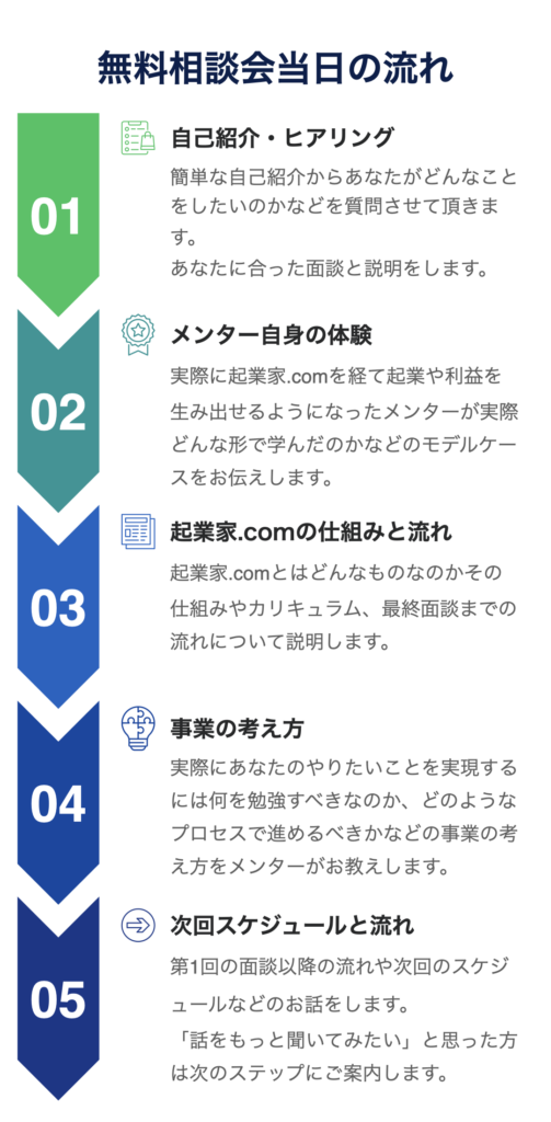 もし、その輪に加わって自分も挑戦してみたい、ビジネスを人々に届けてみたい、そう思ったら起業家.comのメンバーとして起業の世界に飛び込んでみてください。まずは無料相談会にきてみてください。トップクラスの起業家.comのメンターに相談できる機会は今だけです。
